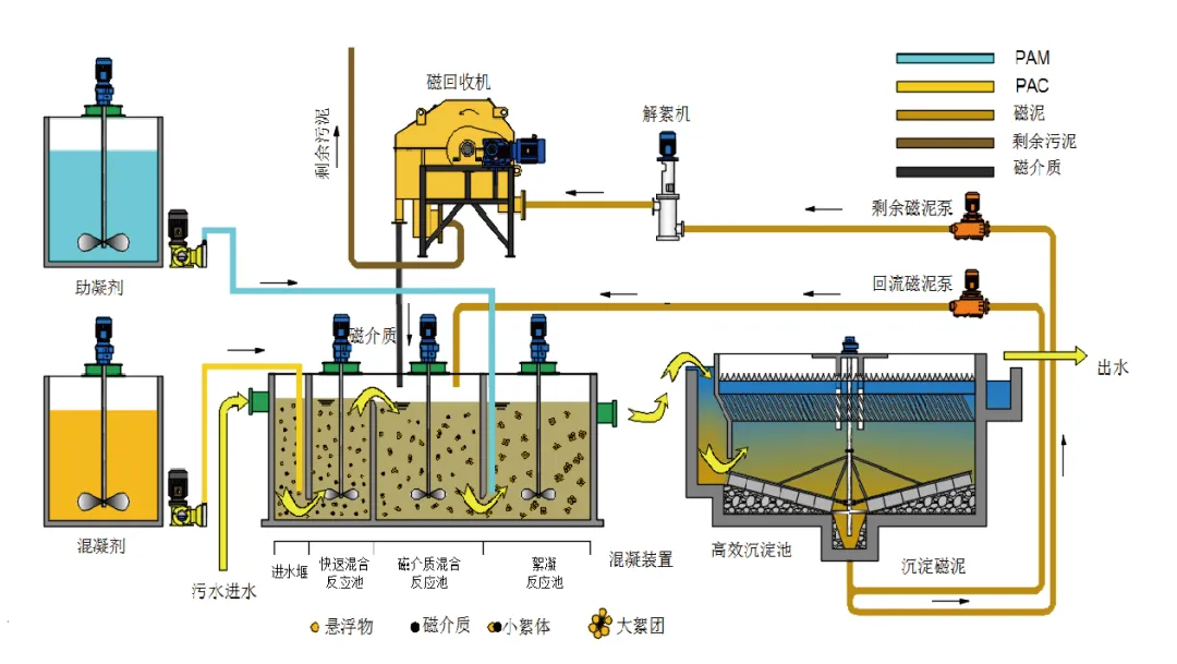 磁混凝处理技术工艺流程 溢流污水处理厂站(磁介质混凝处理技术)