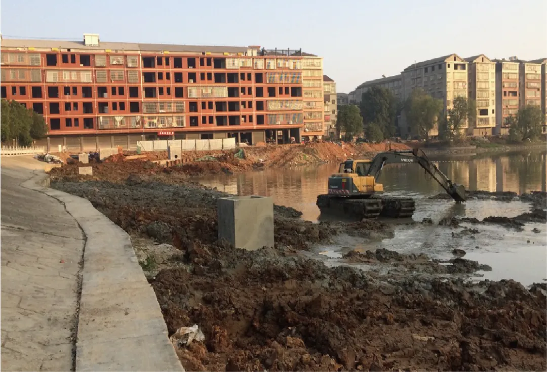 (2)清淤疏浚:清淤方式采用“泵吸+机械”,淤泥自然沥干后作绿化种植土,清理量约3万m³。
