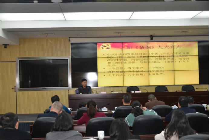 会上省纪委省监委驻厅纪检监察组黄鹏飞副组长对新修订的《中国共产党纪律处分条例》、《中华人民共和国监察法》进行解读。阐明了新修订《条例》的亮点和重要意义,着重就《条例》的政治纪律、组织纪律、廉洁纪律、群众纪律、工作纪律、生活纪律等六大纪律,结合大量鲜活的案例作了详细释义;对《监察法》的重要意义、职责、程序等主要内容进行了全面系统地宣讲。