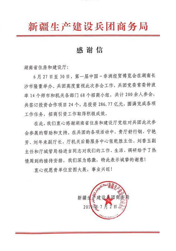 临行时,新疆兵团党委常委钟波一再叮嘱兵团商务局局长刘军国,他在湖南度过了非常愉快的4天,对湖南省住房城乡建设厅的陪同和接待留下了深刻的印象,要求他们一定给湖南省组委会发一封感谢信。新疆兵团商务局副局长陈勇幽默地说:“我们的友谊从现在开始,下次来到新疆,只要一个电话,我绝对像子弹一样飞过来。”