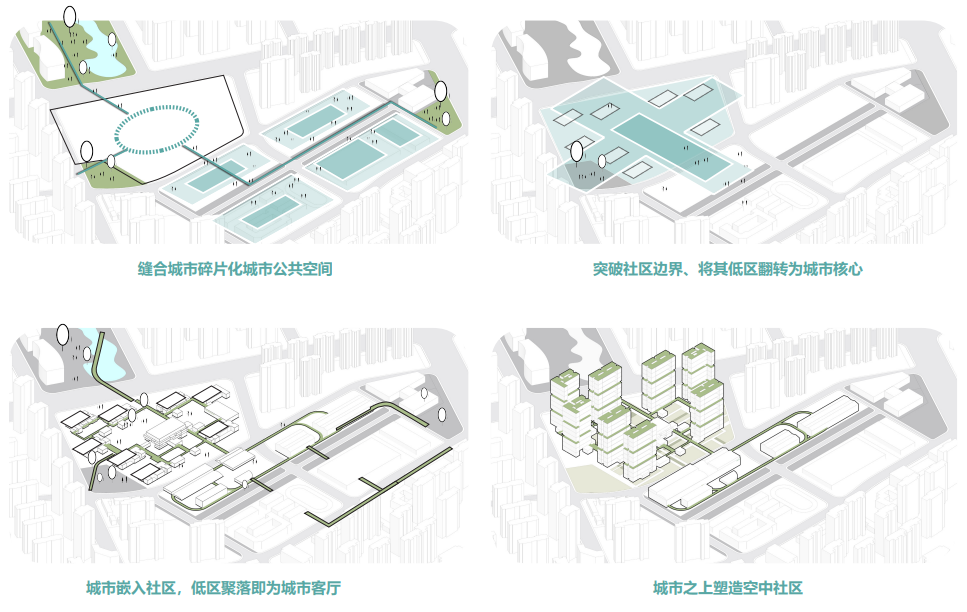 创意提出“城社互嵌”模式。通过将低区功能翻转为“城市客厅”,把公共活力引入社区内部,同时在空中塑造宁静居住社区,形成“城市嵌入社区,社区反哺城市”的共生格局。