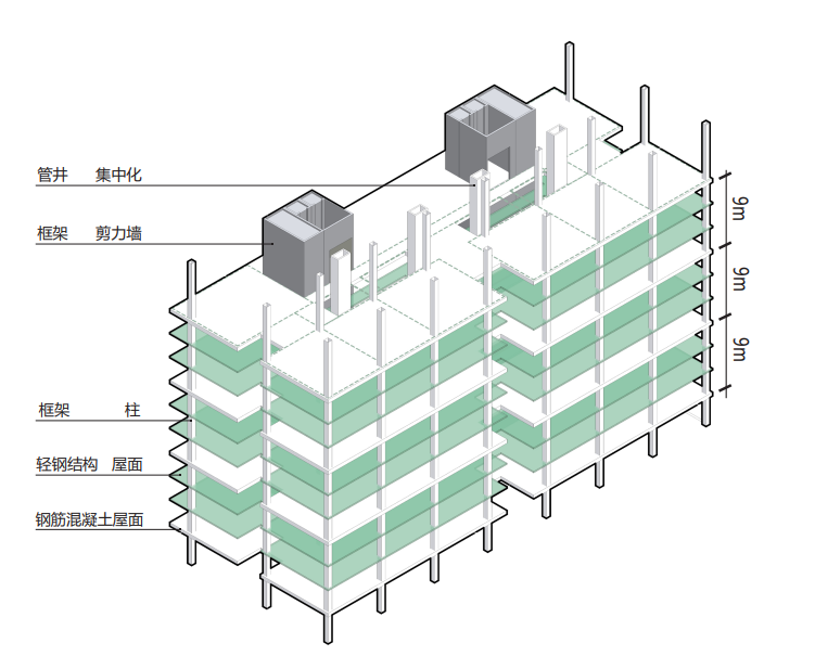 创意提出“弹性生长”可变结构。基于新陈代谢原理,将建筑视为动态过程。单元内采用轻钢楼板及分户墙,可灵活调整甚至拆除形成6m层高空间,满足不同时期功能需求。