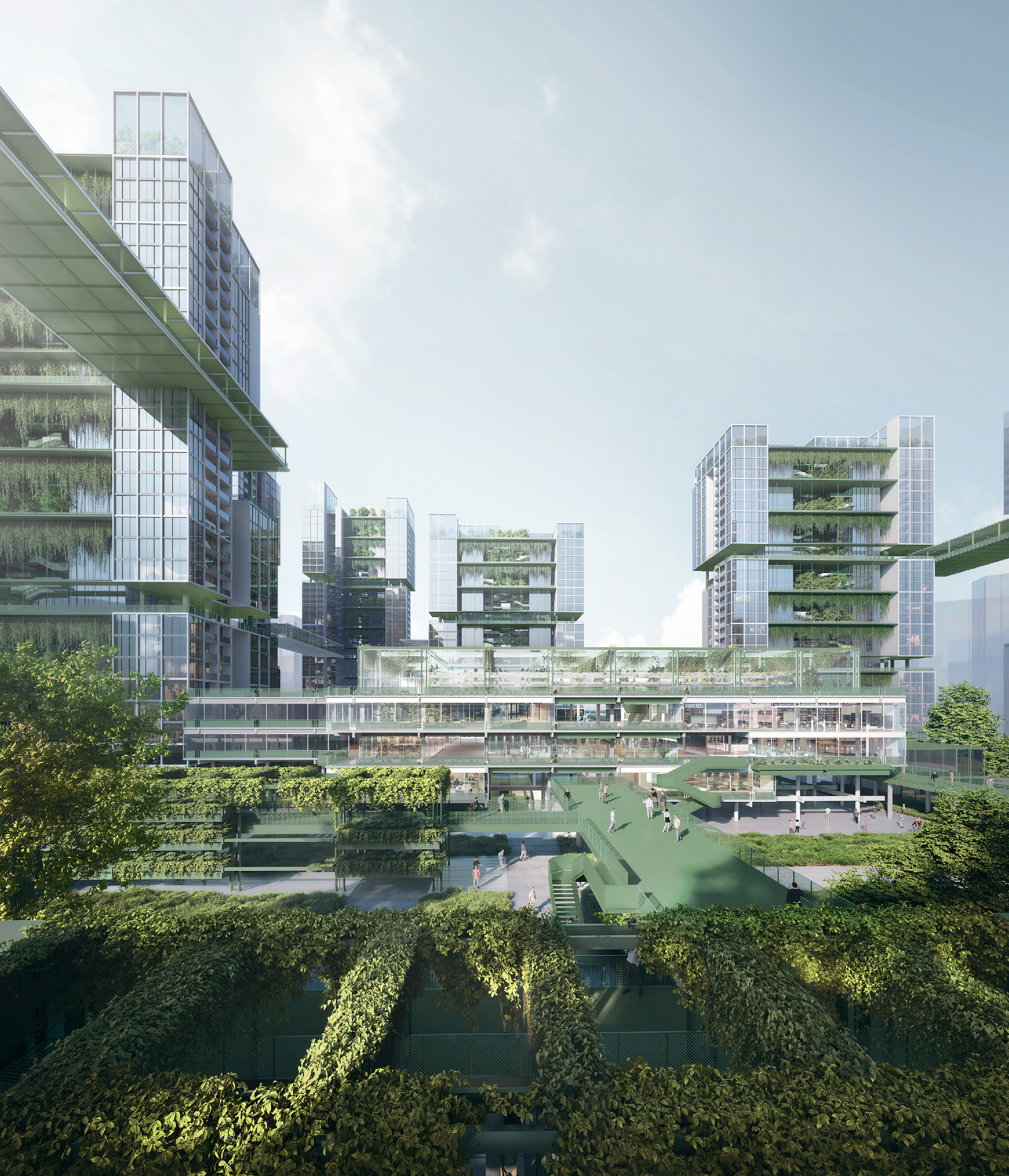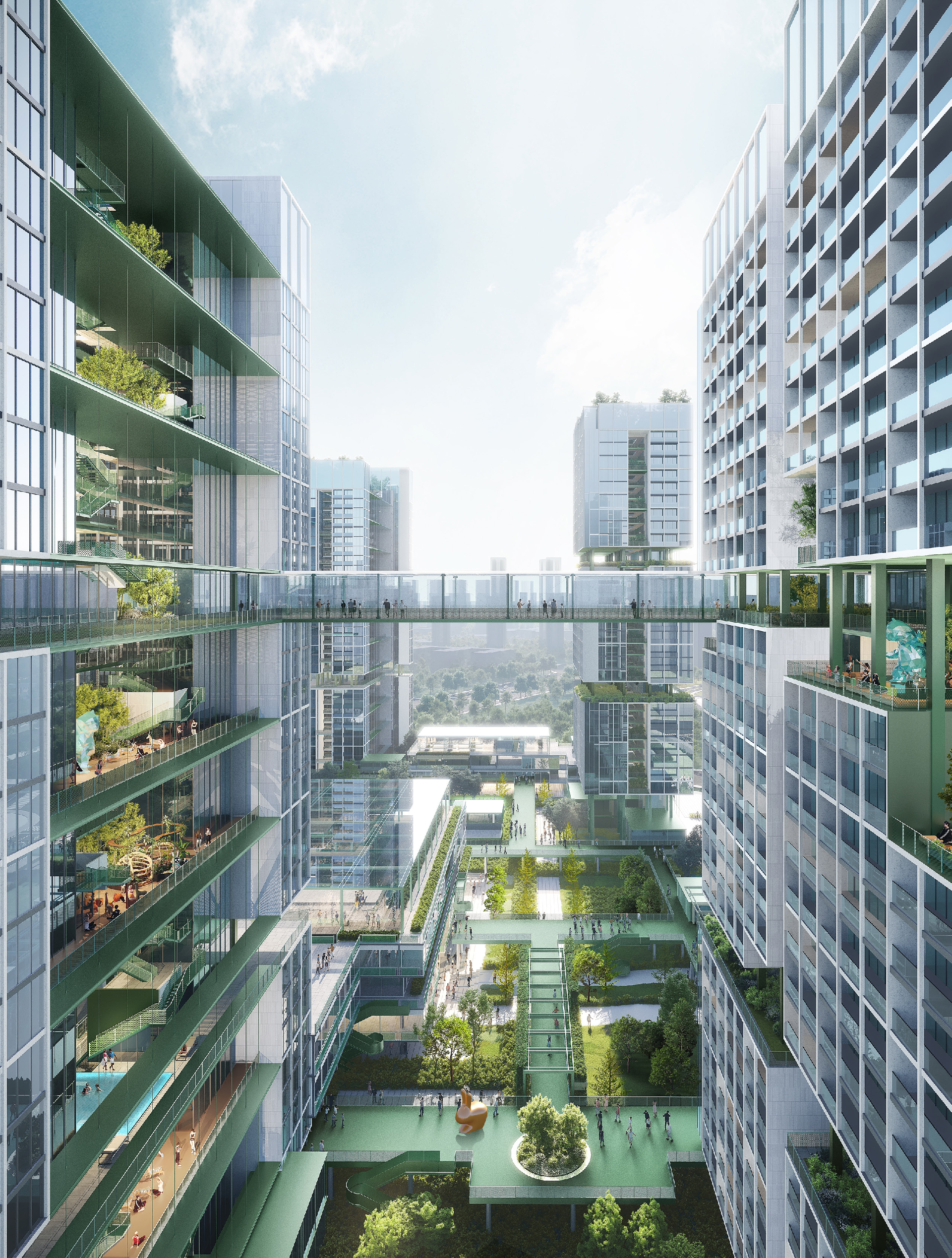 创意提出“城社互嵌”模式。通过将低区功能翻转为“城市客厅”,把公共活力引入社区内部,同时在空中塑造宁静居住社区,形成“城市嵌入社区,社区反哺城市”的共生格局。