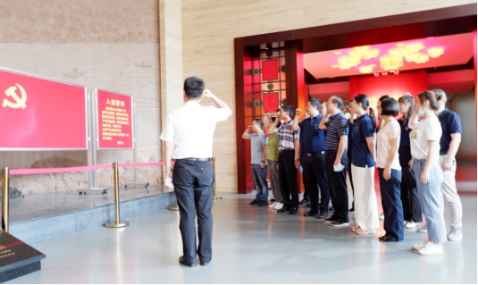 在参观陈列馆前,全体党员一起在大堂的毛泽东、何叔衡赴会中共一大塑像前,面向党旗举起右拳,一起庄严宣誓,重温入党誓词。长沙是中国共产党在国内最早成立组织的地区之一,在中国共产党的历史发展中占有十分重要的地位。党员们首先参观学习的是中国共产党长沙历史陈列馆,馆内展厅一共分为六个展区,展陈以丰富的图片、实物、文献等大量历史资料,再现1921年-2021年以来以毛泽东、何叔衡等为代表的长沙共产党人、长沙党组织领导长沙人民前赴后继,英勇战斗求解放,改天换地、建设美丽家园的百年奋斗史。