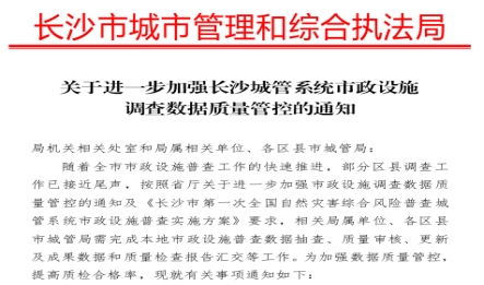 目前,在省厅的专业指导协助下,长沙市各区县城管系统市政设施普查工作已经基本完成了抽样核查任务,待第三方上传质检报告后即可完成汇交工作。