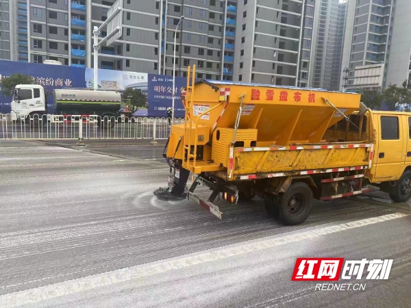 “已有路面结冰情况,请各区马上撒盐处置!”2月5日清晨,天还未亮,长沙市环卫工人早已披着风雪上岗,对路面进行撒盐防冻,撒盐车、除雪车等多种装备上路开道,为上班路和春运路保畅。开福区各重要路段已经第一时间铺设了麻袋,防止行人滑倒。