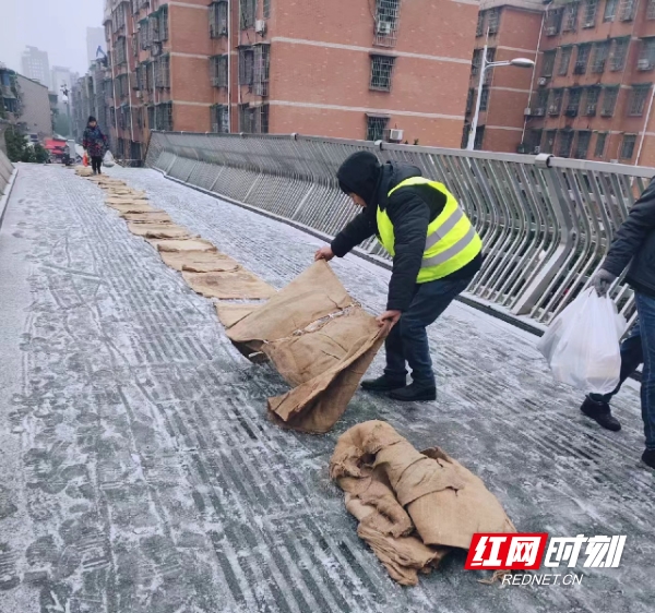长沙市开福区环卫工人在重要路段铺设了麻袋。