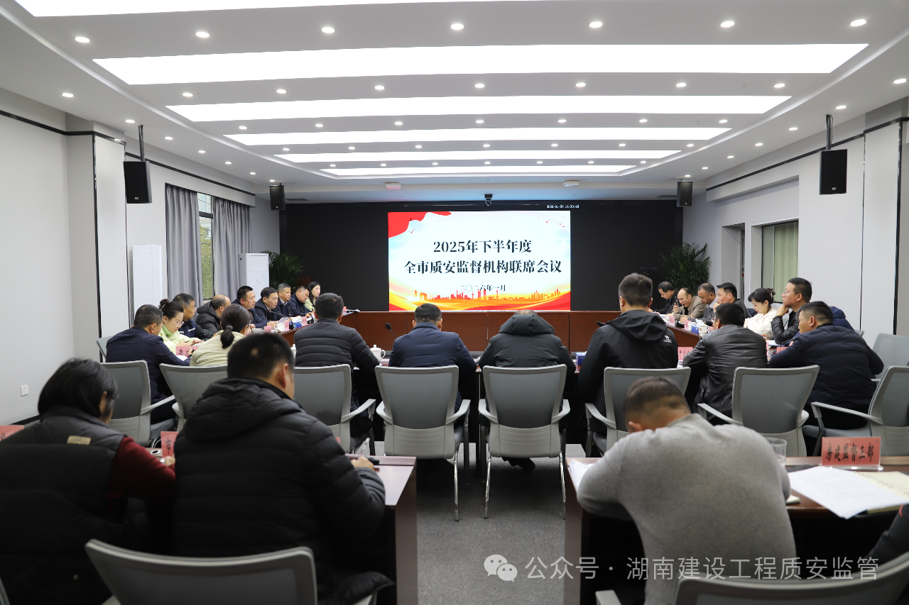 2026年1月29日,长沙市建设工程质量安全监督站组织召开2025年下半年度全市质安监督机构联席会议。会议由市质安站党委书记、站长赵旭主持,市住建局党组成员、副局长刘学军到会指导并讲话。市住建局质安处、市质安站领导班子及相关部室负责人,各区县(市)质安站及园区住建质安部门负责人等40余人参加会议。