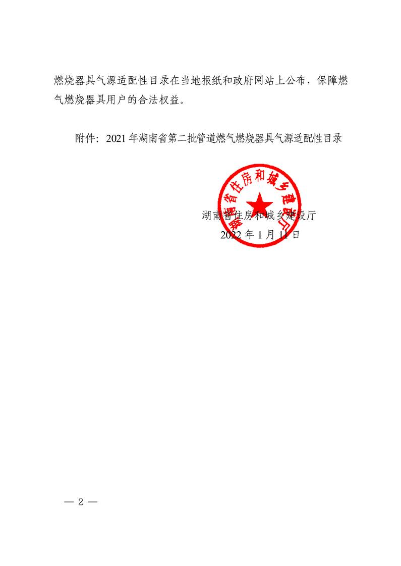 关于公布2021年湖南省第二批管道燃气燃烧器具气源适配性目录的通知