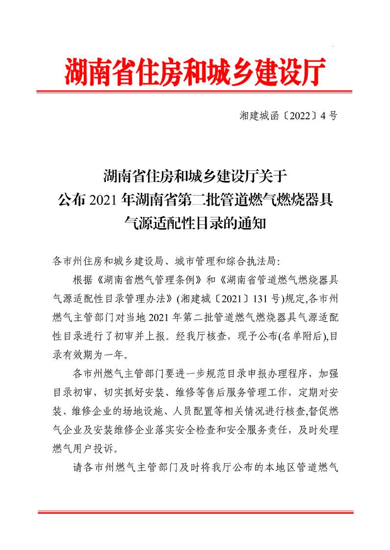 名称: 关于公布2021年湖南省第二批管道燃气燃烧器具气源适配性目录的通知