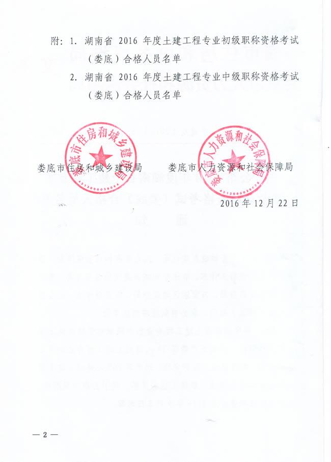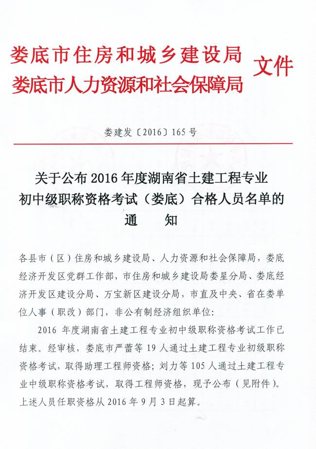 关于公布2016年度湖南省土建工程专业初中级职称资格考试(娄底)合格人员名单的通知