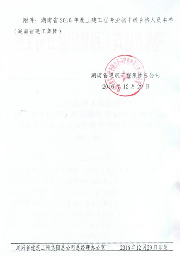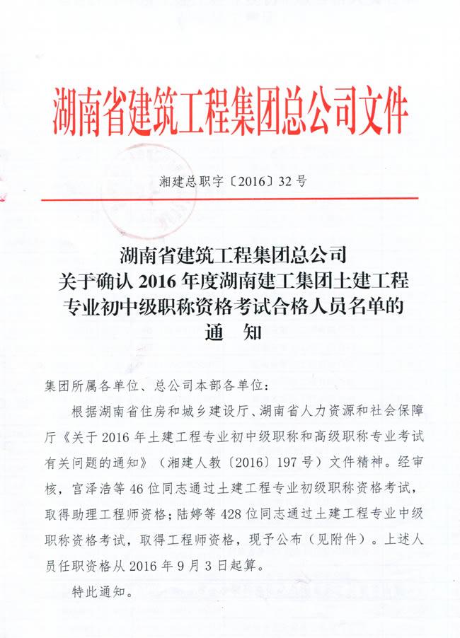 关于确认2016年度湖南建工集团土建工程专业初中级职称资格考试合格人员名单的通知