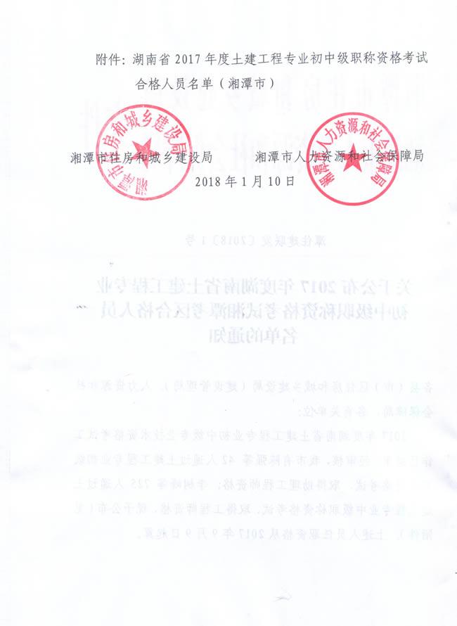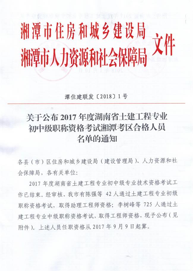 关于公布2017年度湖南省土建工程专业初中级职称资格考试湘潭考区合格人员名单的通知
