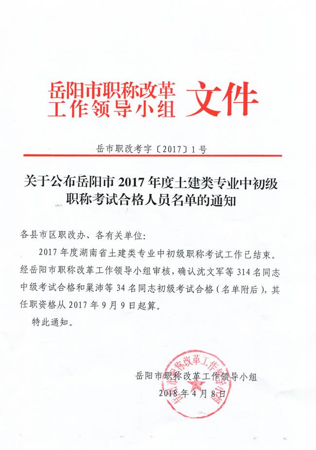 关于公布岳阳市2017年度土建类专业初中级职称考试合格人员名单的通知