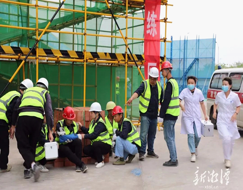 “快,有人受伤了!”演练模拟当天上午10时许,位于湘潭经开区的万境水岸项目3号楼2层裙楼发生一起物体打击和脚手架坍塌事故,分别造成两名工友受伤。项目部迅速启动应急响应程序,迅速开展应急救援。现场抢救组、保卫疏散组、技术查勘组、医疗救护组等分工协作,最终为成功救治伤者赢得了时间。