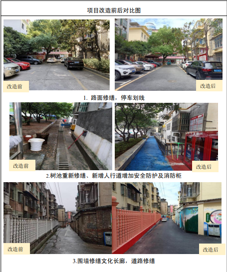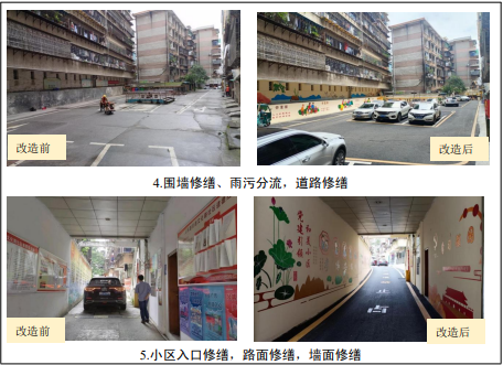 主要包括雨污分流、屋面防水、道路修缮、消防改造、围墙修缮、楼道修缮、景观提质、增设充电棚和健身器材等。
